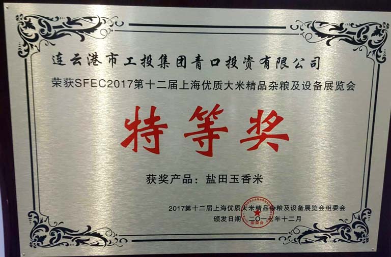 日前,青口投資公司“鹽田玉”大米在2017第十二屆上海優質大米及精品雜糧展覽會上榮獲特等獎,這是繼“江蘇好大米”稱號之后的又一重大殊榮。