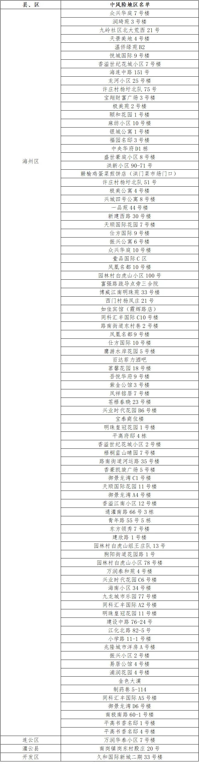 根據(jù)國務(wù)院聯(lián)防聯(lián)控機(jī)制有關(guān)規(guī)定,經(jīng)綜合評估研判,市指揮部決定,自發(fā)布之日起,將海州區(qū)浦潤花園4號樓、金色大漠、制藥巷5-114、同科匯豐國際A5號樓、御景龍灣D6號樓、南極南路60-1號樓、平高書香名邸1號樓、平高書香名邸4號樓調(diào)整為中風(fēng)險(xiǎn)地區(qū)。其他地區(qū)風(fēng)險(xiǎn)等級不變。調(diào)整后全市現(xiàn)有89個(gè)中風(fēng)險(xiǎn)地區(qū)。