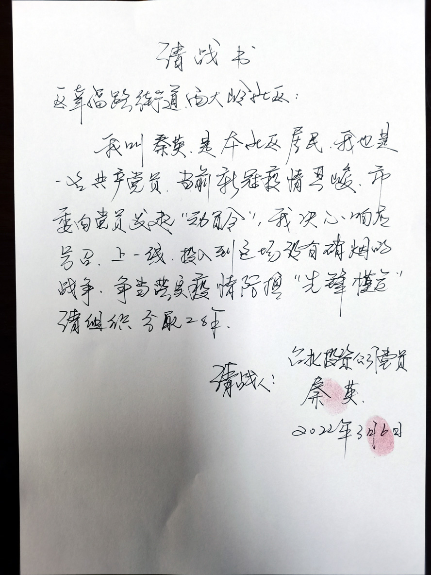 “我做的這一切都不算什么,你們看看那些醫護人員,他們才是真正的英雄,他們坐到那張桌子上,一般來講都會超過12個小時,為了不上廁所,人家連水都不喝一口,他們才是真的英雄。”面對筆者的采訪秦英一個勁的推辭:“我們之所以能戰勝疫情就是因為我們有偉大的黨,因為有全心全意為人民服務的共產黨員。我是共產黨員,這都是我應該做的。”秦英樸質又擲地有聲的話語,體現了一名老黨員抗責在肩、以身作則、勇挑重擔的崇高情懷,代表了一大批退休老黨員以百姓之心為心的高尚品德,彰顯了共產黨人為人民謀幸福的初心。