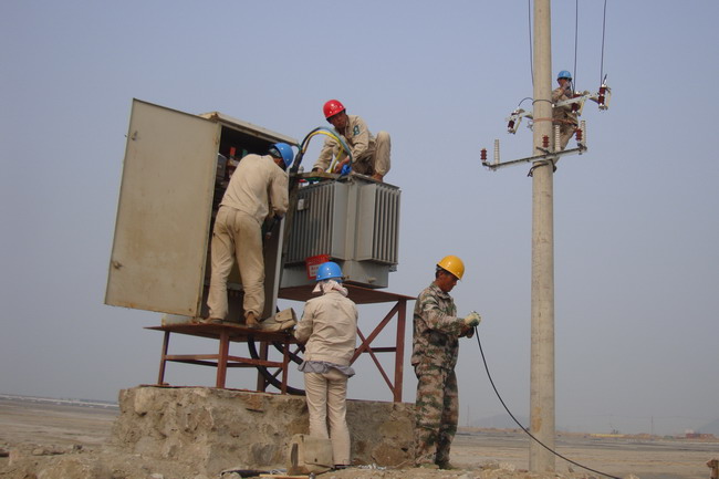 金海一期二次B3區加固地基工程要求在5月10前具備全面抽真空條件。臺北供電所承擔此項電力工程,需架設10千伏線路2280米,安裝19臺變壓器及配電箱,工程總量170萬元。為使工程按時完成,維護供電所的信譽,展示自己的實力,該所細心謀劃,調配車輛,拉材備料,認真組織人力抓緊施工。現場施工條件惡劣,亂石堆放,腳下無路,給施工作業帶來重重困難。職工作業汗流浹背,吃苦耐勞,無怨無悔。憑著頑強的斗志,認真地堅守的崗位,聚精會神地操作,為連云新城“一年拉框架,兩年出形象,三年基本建成”的戰略建設,奉獻自己的力量。