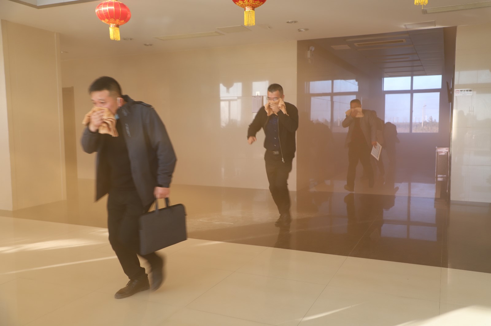 此次實戰演練的“突發事件”地點設在機關大樓,所有參訓人員按照既定的消防應急預案進行了一次消防安全模擬演練。隨著“消防警報聲”響起,正在大樓內工作的員工在濃煙中用濕巾捂嘴、彎腰、靠墻從樓梯道口迅速有序地疏散、撤離,在假定火災發生條件下進行逃生自救實戰演練。救援組、疏散組、后勤組各組成員各負其職,配合有序,隨后,大家在樓前廣場上進行了滅火器實戰操作訓練。