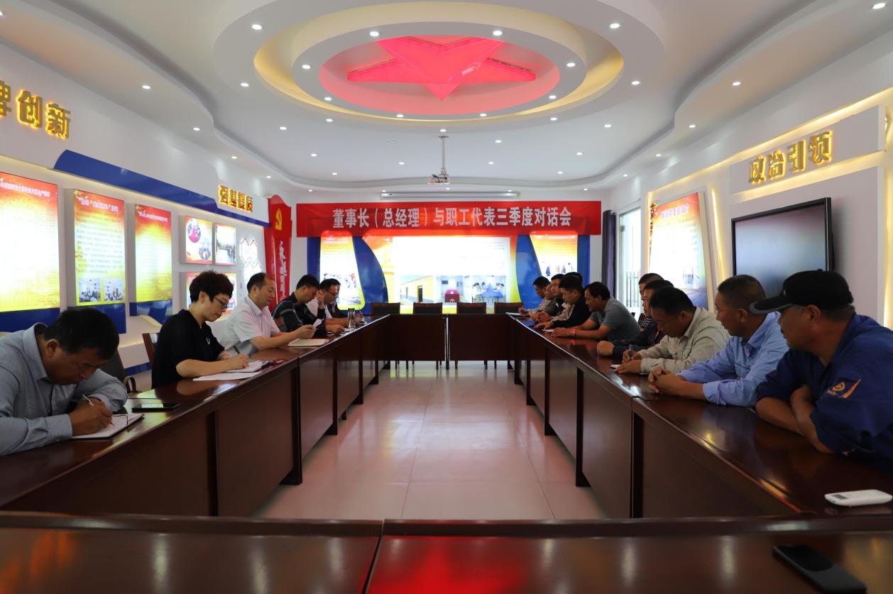 10月8日下午,在新河制鹽分公司會議室召開三季度董事長(總經理)與職工代表對話會,投資公司黨委書記、董事長、總經理李國文,常務副總經理吳衛平,黨委副書記、工會主席王宏參與職工代表對話。