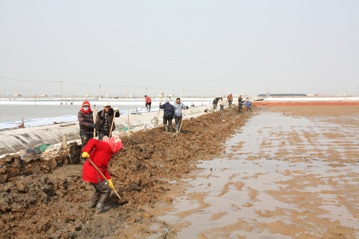3月21日,在新河制鹽分公司八班的一期結晶區,一片火熱景象,只見大家正在灘內揮膀大干,挖泥的、和泥的、打堰的,配合密切,運作熟練,參加勞動的職工足有50余人。“為了加快食用原料海鹽基地建設進度,今天,我們集中了7個組班的員工幫助八班維修下馬格格堰,爭取早日灌池生產。”正在工作現場安排工作的該公司經理安樹林說道。