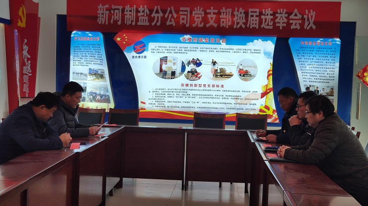 2021年4月1日上午,新河制鹽分公司黨支部委員會召開換屆選舉會議,會議由黨支部副書記耿劉主持,并作了換屆選舉工作報告。
