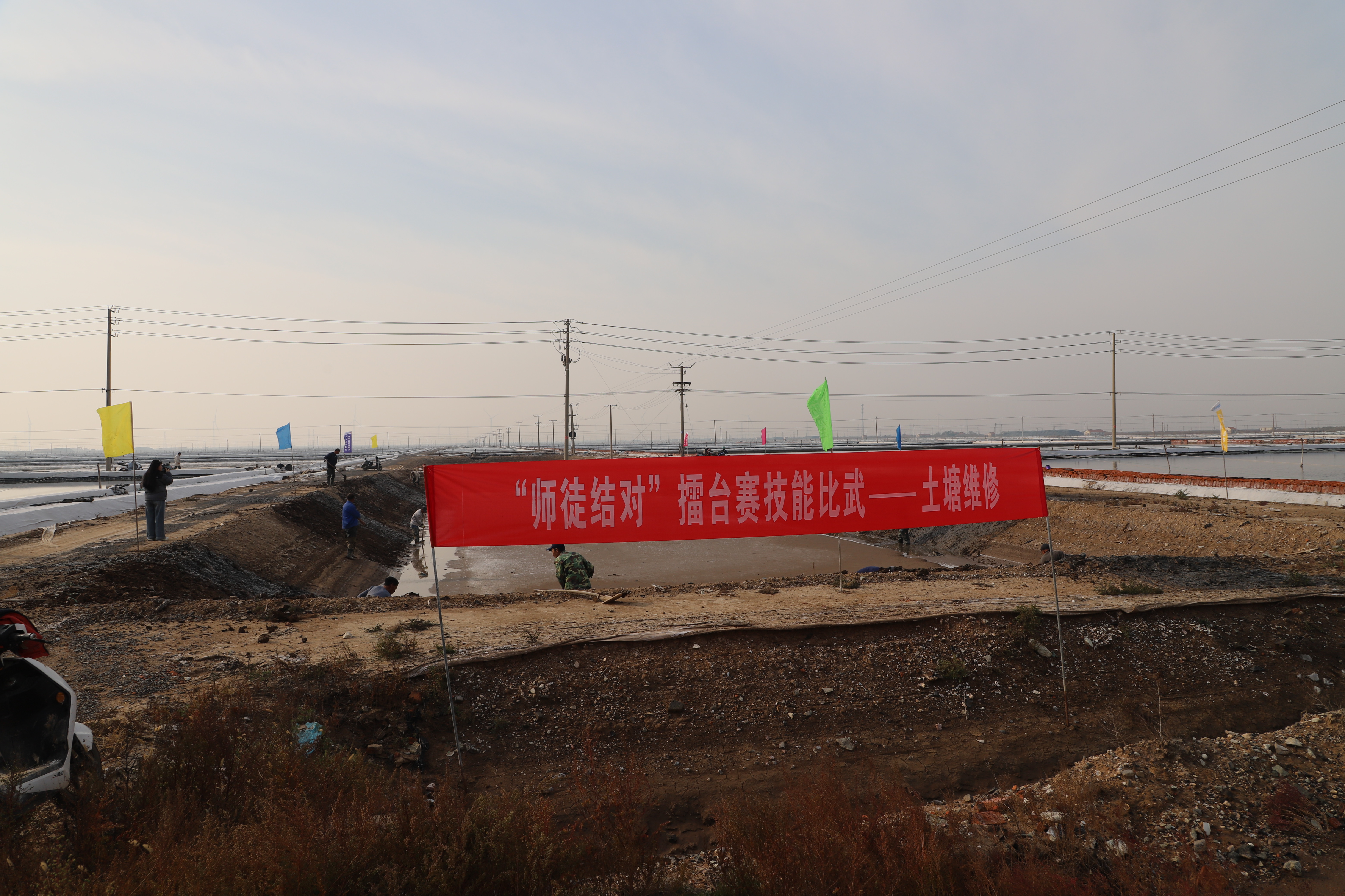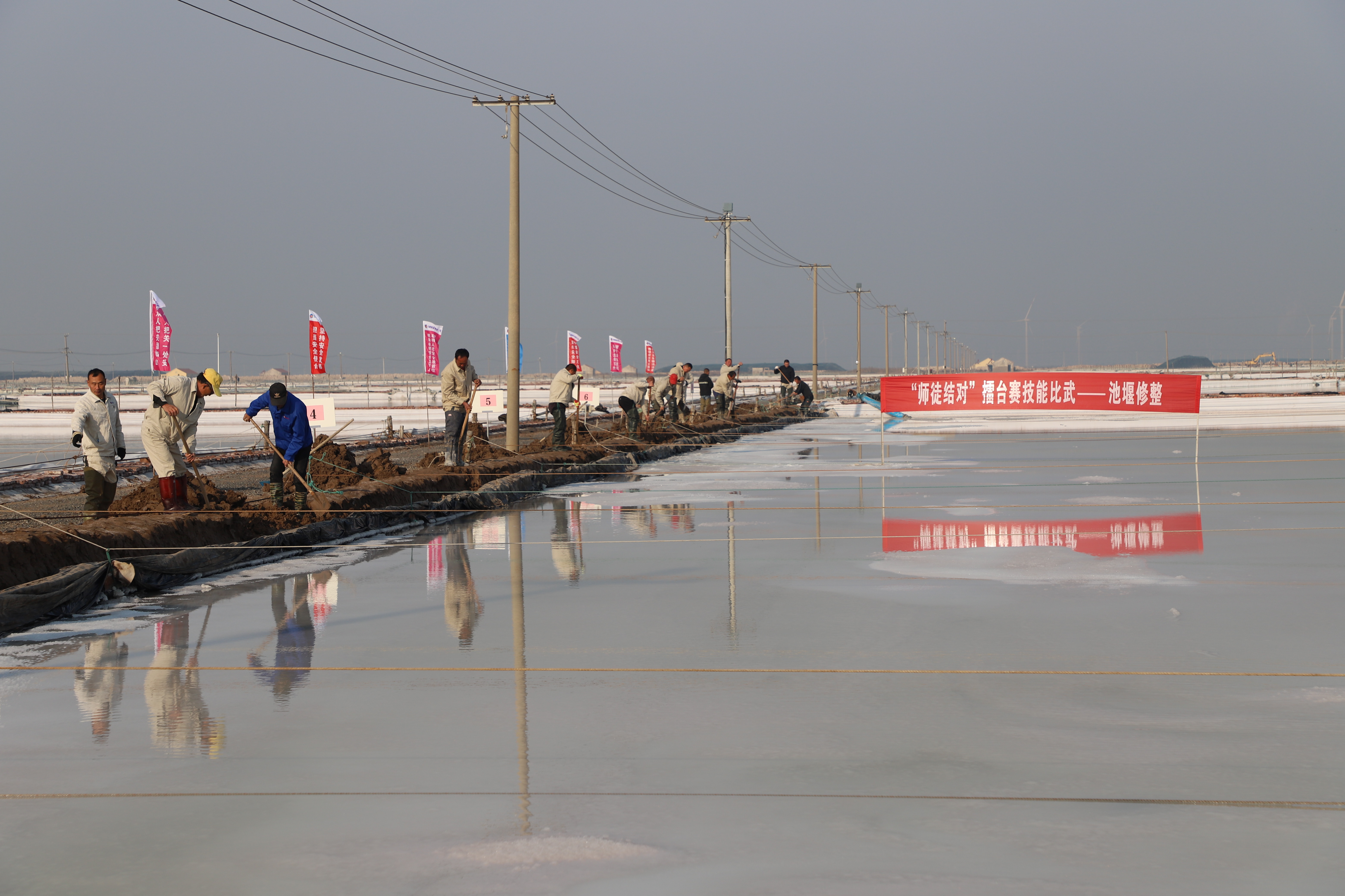 寒冬時(shí)節(jié),暖陽(yáng)之下,鹽廩之旁,曬得黝黑的鹽場(chǎng)產(chǎn)業(yè)工人們按照競(jìng)賽的考核標(biāo)準(zhǔn),做熟泥、打堰墻、做堰頂,護(hù)埝頂、夯埝坡、清塘底,由此,見證了一場(chǎng)技能比拼的盛會(huì)。