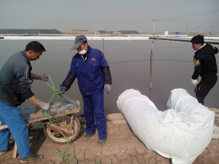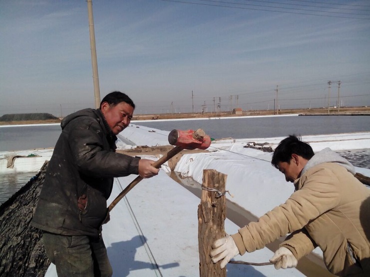 實業公司制鹽分公司加快推進灘場文明建設。截止日前,分公司海鹽基地二班已上齊土工布二千六百米,打樁一百八十四根,為今年制鹵提供了有力保障。(實業公司)