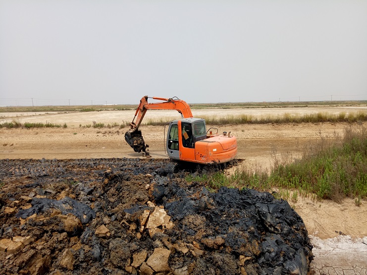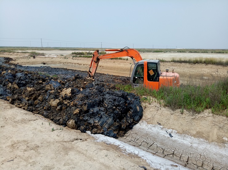 海鹽基地一班班組近日對土塘進行清淤改造。兩臺挖掘機頂著連日來的高溫天氣連續工作。現該班班組的三排土塘清淤改造工作基本完成。(實業公司)