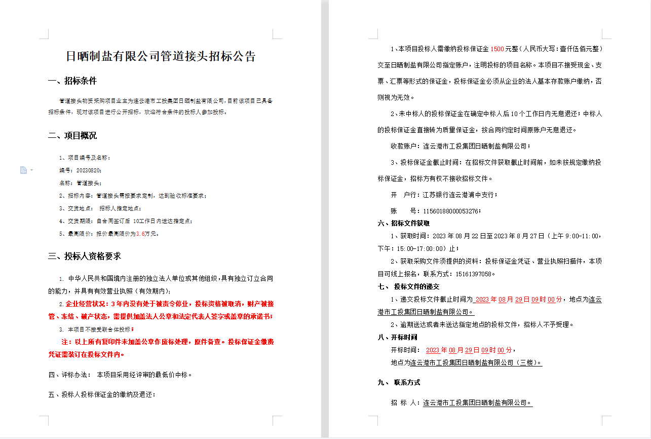 日曬制鹽有限公司管道接頭招標(biāo)公告