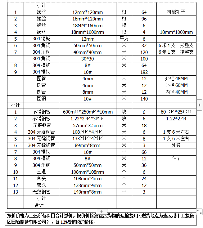單價(jià)(含13%稅、運(yùn)輸費(fèi)用)。合同期間304不銹鋼單價(jià)不以304不銹鋼市場單價(jià)的變動(dòng)而作任何調(diào)整。