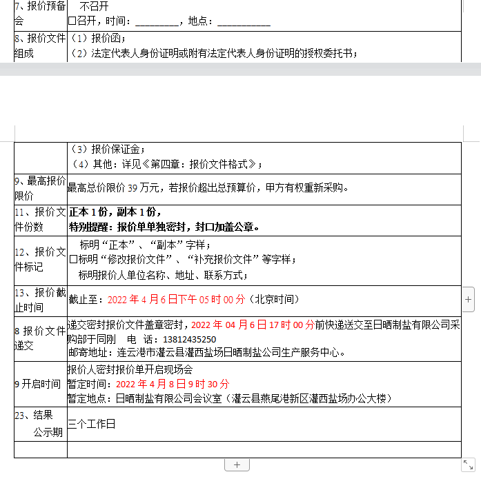 密封報(bào)價(jià)開啟時(shí)間及地點(diǎn):2022年04月8日前,如有特殊情況時(shí)間另行通知。