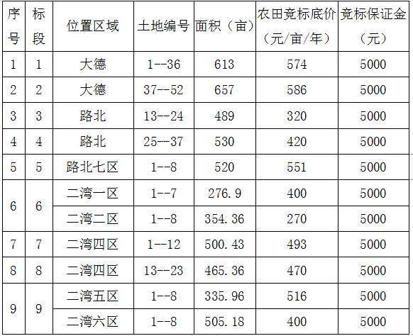 一、競標農田標段、位置、面積、競標底價、競標保證金: