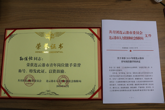 格斯達擔保公司業務一部副經理、贛榆分部副經理孫佳忙同志,榮獲2018年度連云港市“青年崗位能手”榮譽稱號。