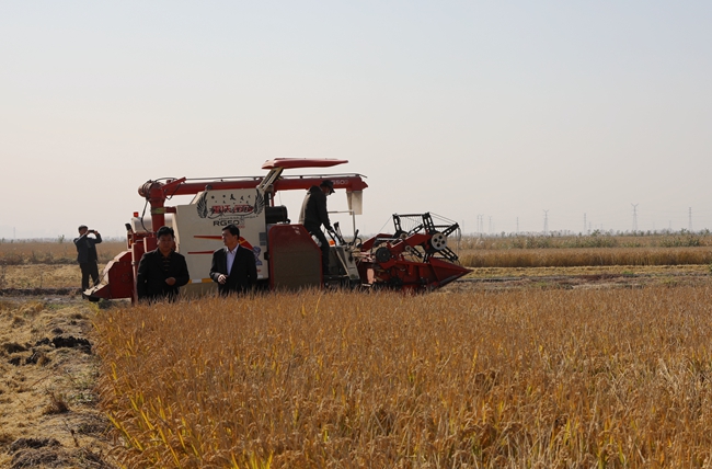 11月4日上午,晴空萬里,在喜慶的鞭炮聲和收割機的轟鳴聲中,公司萬畝水稻正式開鐮,一年一度的收割任務全面展開。黨委書記、董事長胡傳法、副總經理周緒祥到場指導。