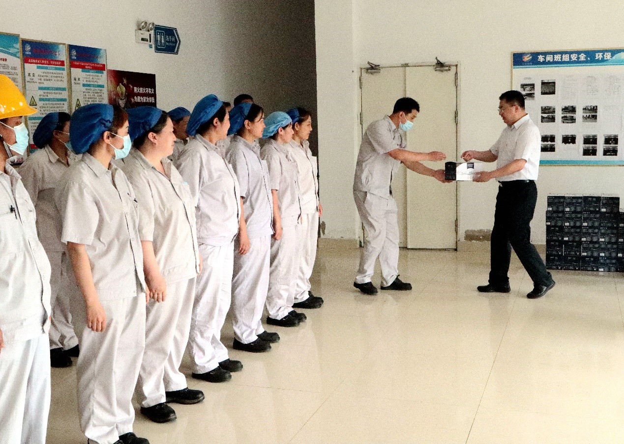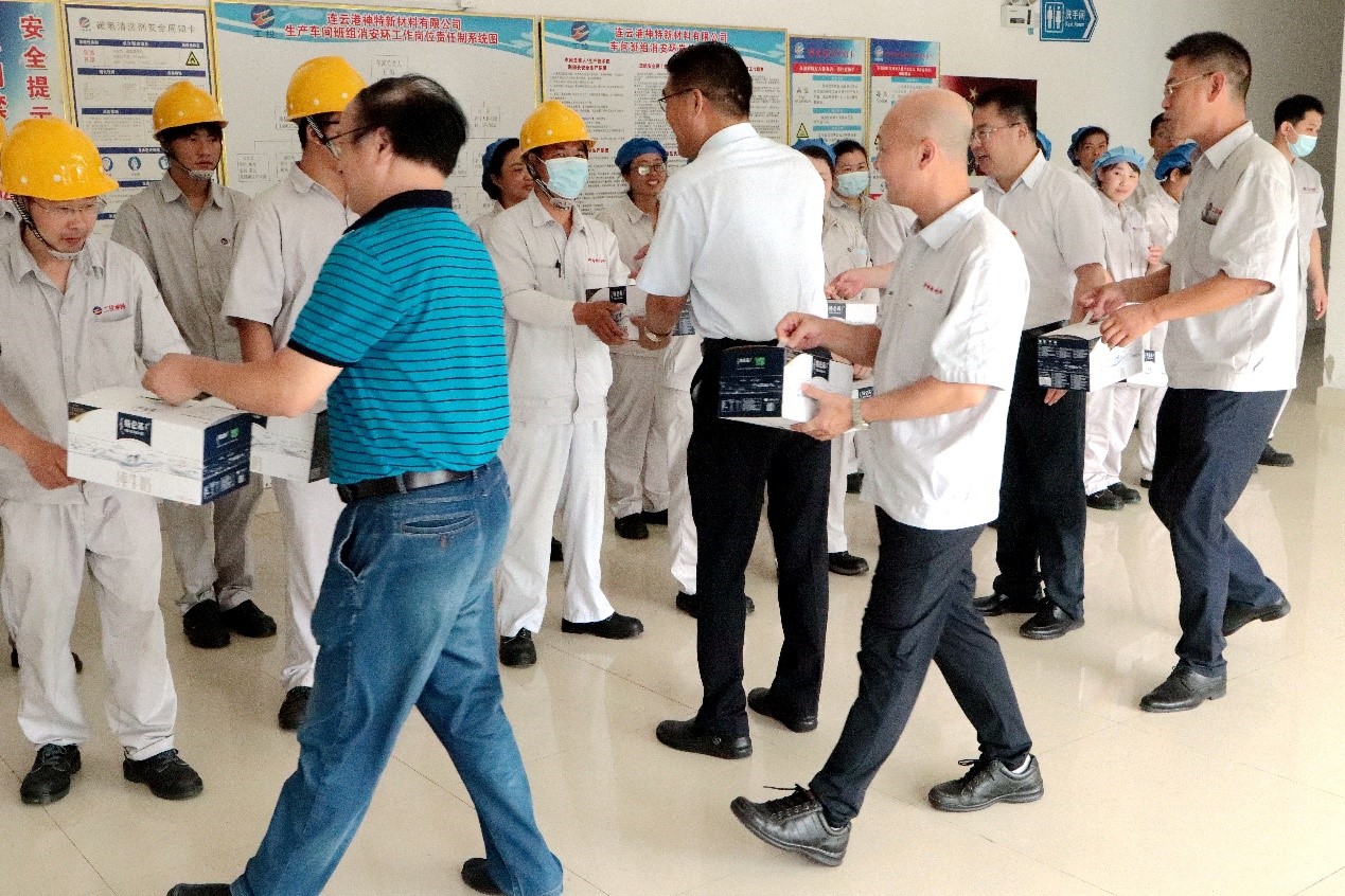 728日上午,集團公司黨委副書記戴鴻鳴、工會主席劉承志一行到公司慰問生產一線員工,為生產一線員工送來牛奶、綠豆、白糖、大米等防暑降溫慰問品。公司董事長張斌、總經理韓立新等領導陪同。