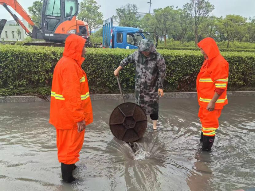盛達市政分公司支委在“責任區(qū)”一線指揮,黨員沖鋒在前,24小時不間斷,在防汛一線筑牢“紅色城墻”,全力守護人民群眾生命財產(chǎn)安全。前后出動車輛設備10余輛,處理道路積水20余處,應急開放閘9次,處理12345平臺案件100余件,應急打開圍堰4處,24小時監(jiān)護新光和花果山涵洞,緊急處理公交站臺、交通標志牌等城市家具傾倒7處;翔立分公司多次緊急“處警”,快速修復開太閘電路等多處電力故障,保障開發(fā)區(qū)泄洪秩序。