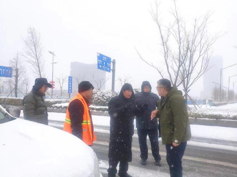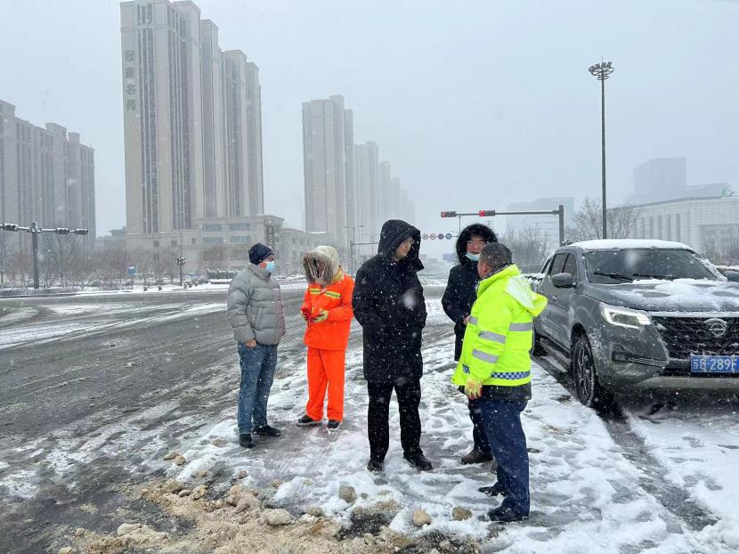 上午10時(shí)許,暴雪如約而至。裝有融雪劑的車輛全部整裝待發(fā),聞令而動(dòng),采取“人工+機(jī)械”不間斷作業(yè)模式,對(duì)轄區(qū)主次干道、橋涵、火車站東站、創(chuàng)智大廈等帶坡路段及時(shí)拋撒融雪劑,采取“滾刷+鏟車”組合方式,反復(fù)排掃路面積雪,確保主次干道、帶坡路段通暢無冰。