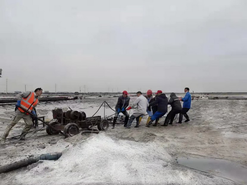 在海州灣大浦班組367畝的礦鹽生產(chǎn)灘地上,遠(yuǎn)遠(yuǎn)的看去,只有三個(gè)人在灘地上忙碌,分別是班長(zhǎng)孫和華和兩名鹽工。在十月份的時(shí)候,原大浦班組班長(zhǎng)夏軍帶領(lǐng)第一批鹽工前往海福特,孫和華因?yàn)樯眢w原因選擇了留下,此時(shí),生產(chǎn)班組人數(shù)減半,只剩下三人。新產(chǎn)業(yè)要開(kāi)發(fā),礦鹽復(fù)產(chǎn)也要攻堅(jiān),當(dāng)公司征求部分職工意見(jiàn),誰(shuí)愿意來(lái)做大浦班組的班長(zhǎng),維持礦鹽正常生產(chǎn)。大家心里都明白,這不是一份榮譽(yù),而是一份責(zé)任,是千斤重?fù)?dān),一片生產(chǎn)灘地只有三人,這是一個(gè)燙手山芋的活。這時(shí),孫和華站了出來(lái),他說(shuō):“我是一名老黨員了,黨員就是要平時(shí)看出來(lái)、困難站出來(lái)、危急豁出來(lái),為其他同志樹(shù)立黨員先鋒模范作用,這份擔(dān)子,理應(yīng)我來(lái)挑!”
