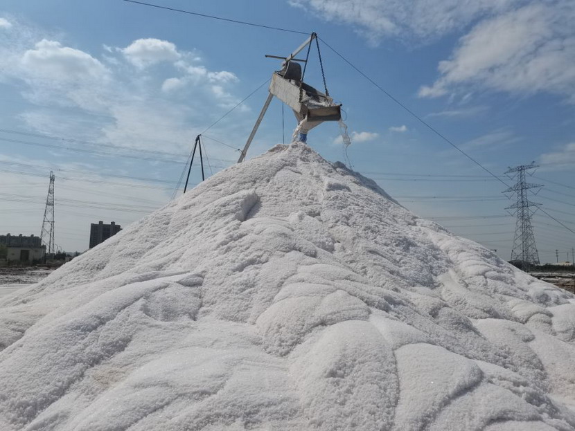 第一片180公畝的曬鹽池已經收鹽完畢,工人師傅們嫻熟有序用塑布對鹽廩進行覆蓋,預防雨水造成鹽斤淌化。
