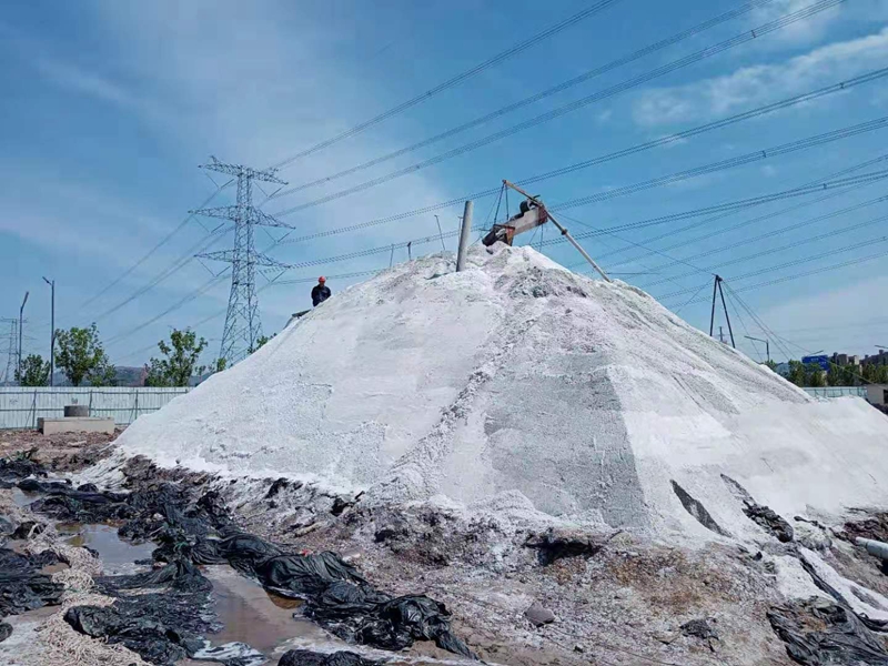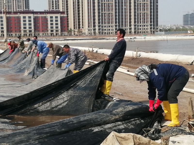 “一二三、起,注意塑布壞的地方要抓緊了”,在西灘組長沈秀成的帶領下,大家正在清理塑布積水,一場暴風雨過后,灘面積聚了大量雨水,擋浪布也損壞較多,為了不影響下一步的人工扒鹽,大伙迅速做好災后修復工作,保住生產成果,確保顆粒歸倉。