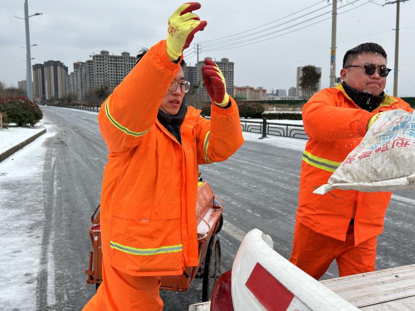 本次掃雪除冰共配備了3輛清掃車、2輛鏟車、1輛撒布機以及20余噸融雪劑,20余把推雪鏟、鐵鍬等清雪工具,采取“邊下邊除、邊除邊清、邊清邊運”的方式,根據道路積雪厚度和結冰情況,通過撒布融雪劑、除雪鏟推雪、人工配合等多措并舉,有效清理區內主干道積雪,做到“即下即掃、雪停路清”,保障群眾出行安全。此外,針對紅綠燈路口、馬路轉彎處、陡坡、橋面以及非機動車道等重要節點,環衛分公司又出動了100余名工作人員點對點人工撒布融雪劑,共保障面積300余萬平方米。