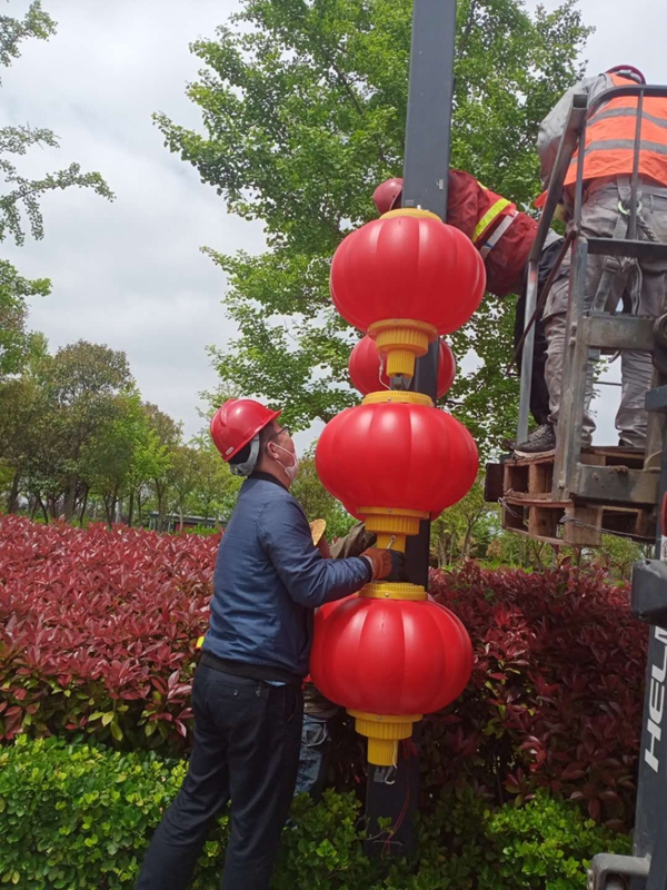施工現(xiàn)場(chǎng)大家配合默契利用小型叉車進(jìn)行輔助拆除作業(yè),五分鐘不用一個(gè)燈籠就拆除完成。這邊完成拆除部分,那邊負(fù)責(zé)還原以及運(yùn)送回收。由于燈籠的不可收攏同時(shí)為避免造成二次污染,對(duì)于拆下來(lái)的燈籠及時(shí)進(jìn)行運(yùn)送回收保存,確保第二年要安裝的時(shí)候重復(fù)利用。